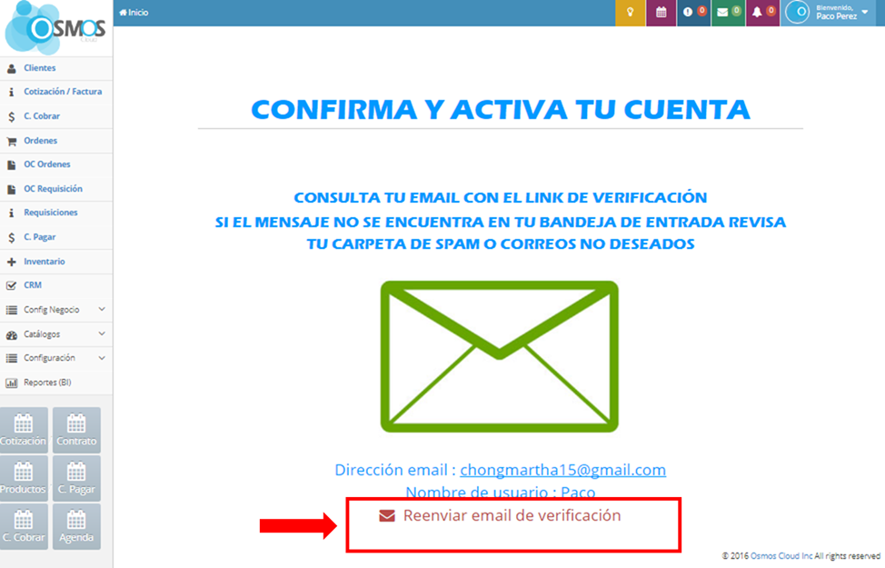 NOTA: Si no recibiste el correo de activación revisa que este bien escrito y haz clic en "Reenviar email de verificación" en la parte inferior de tu pantalla.