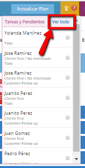 Este icono te mostrará un listado los prospectos y clientes con tareas pendientes. Si quiere ver el detalle de los pendientes y tareas da clic en “Ver todo” y este te llevara a una pantalla con más información.